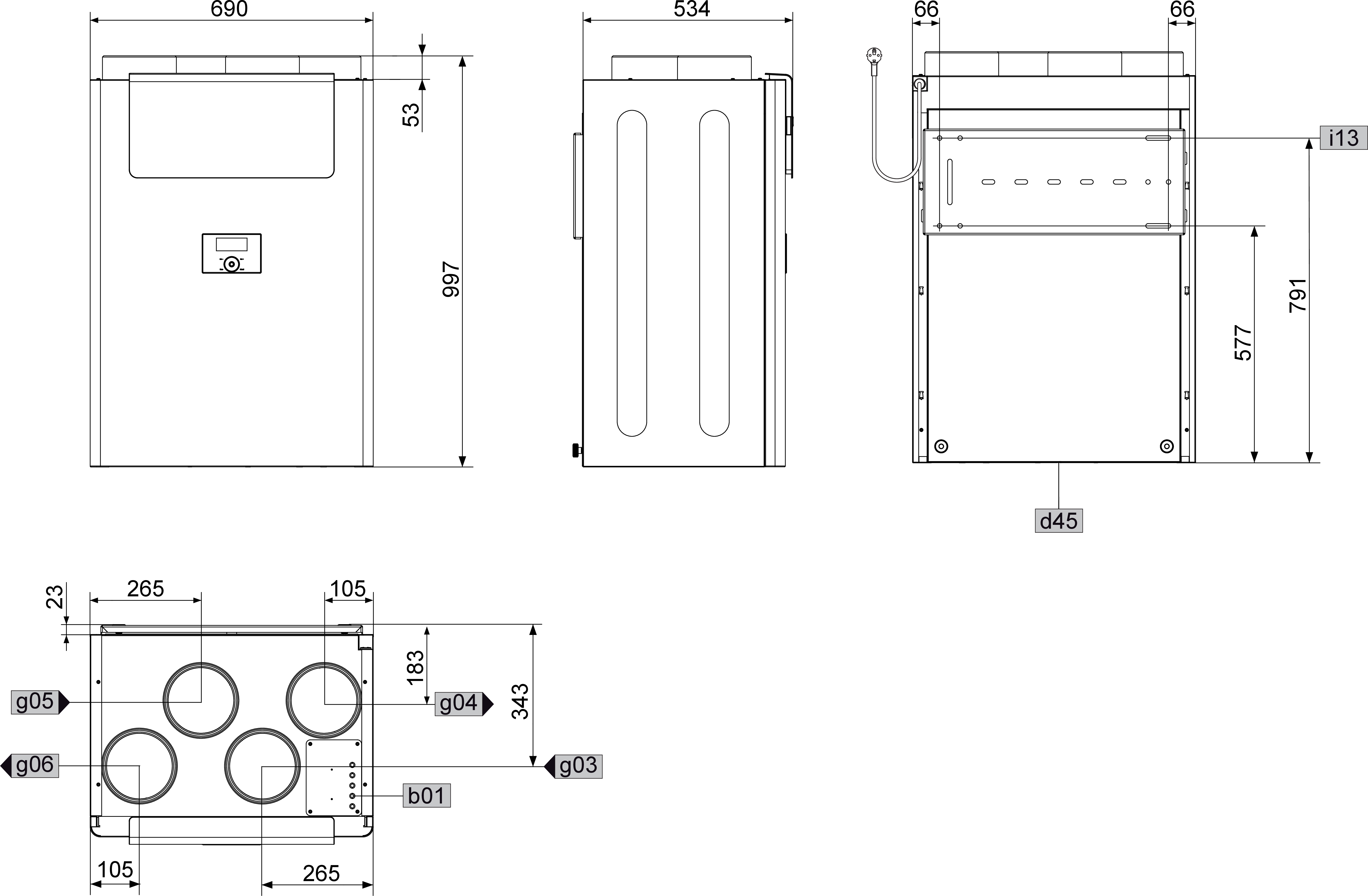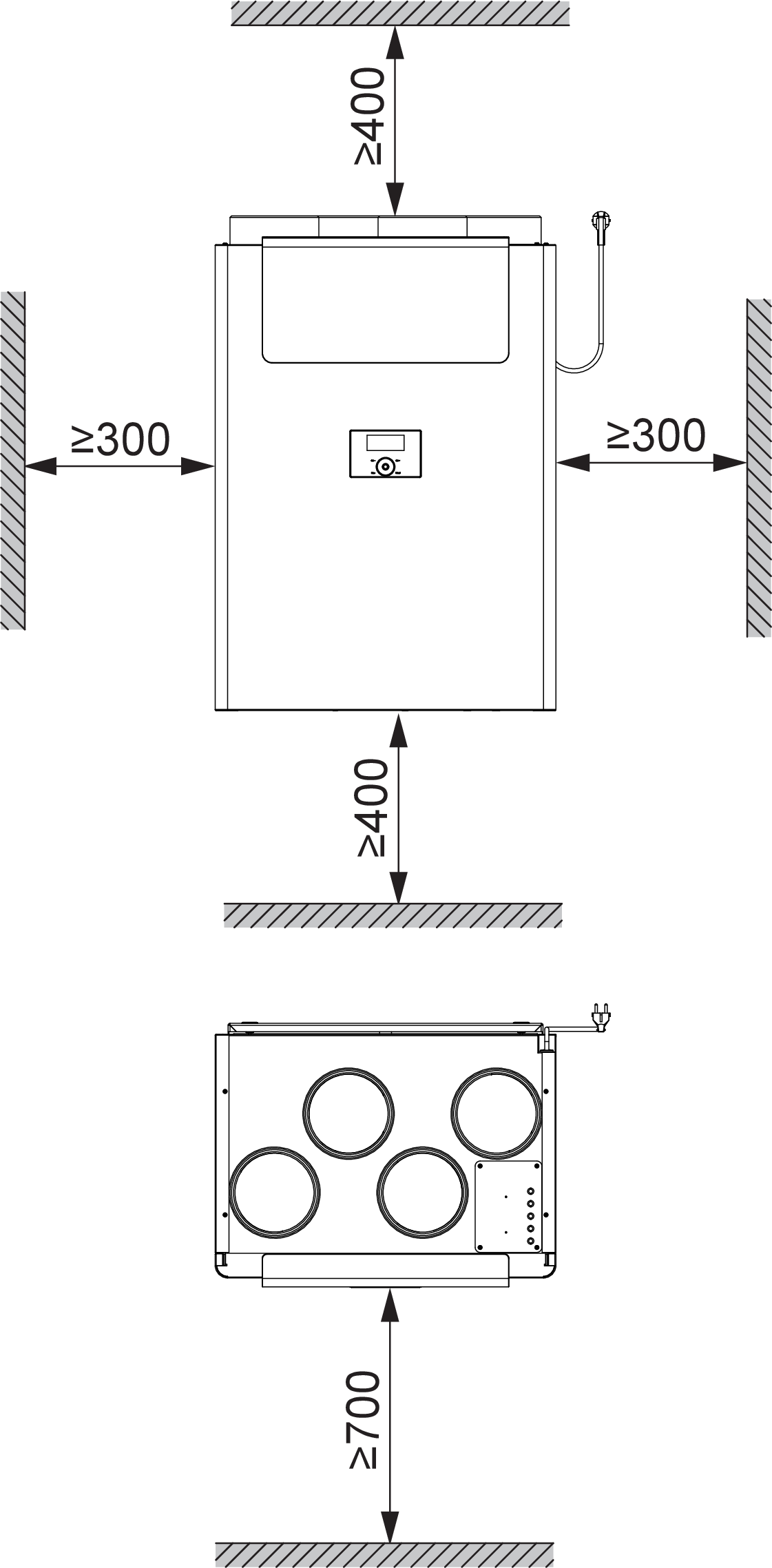 Installation in dwellings, utility rooms, basement rooms, etc. The air connections are located at the top of the unit; easy access to the electrical connection panel without having to open the unit; duplex sheet steel casing; visible surface in alpine white with powder coated finish.