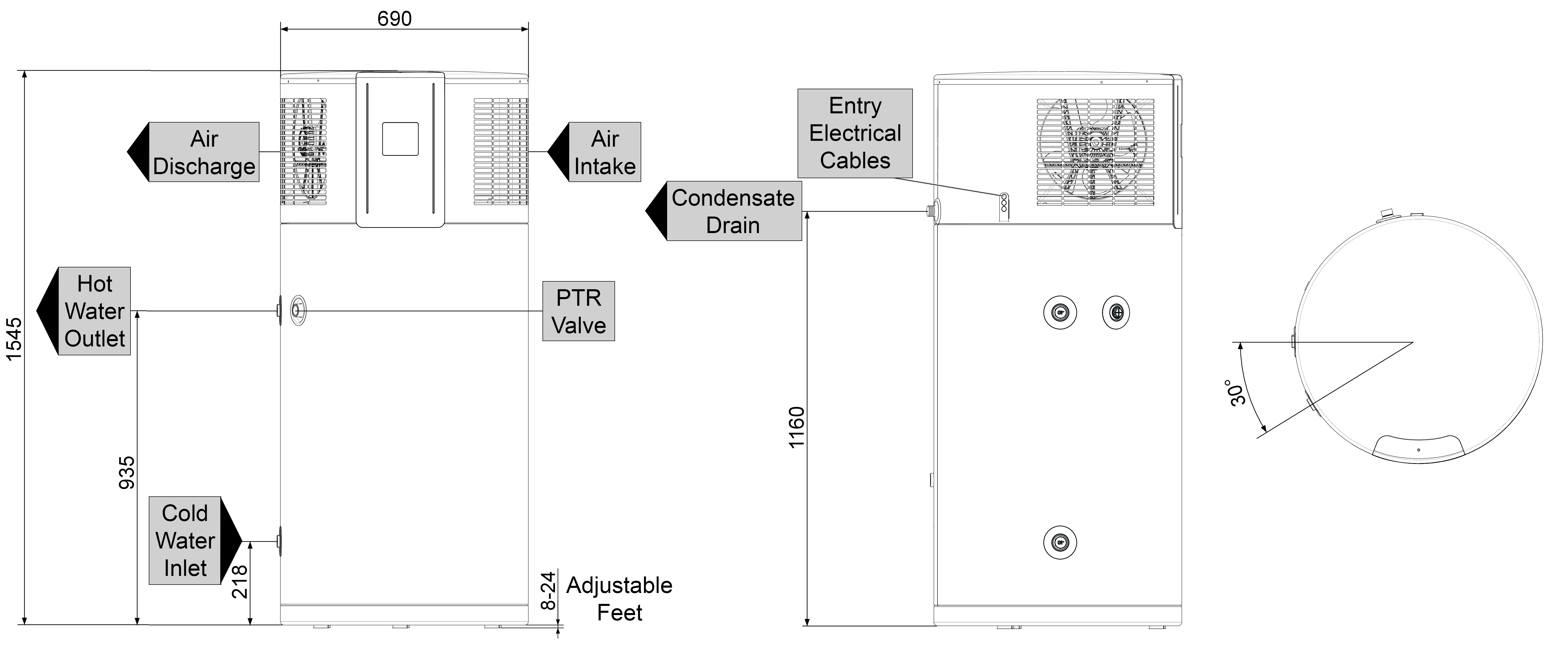 - 220 litre tank with high volume of hot water can deliver 360 L of 40°C shower temperature water at a cold water temperature of 20°C (302 litre tank delivers 540 litres)