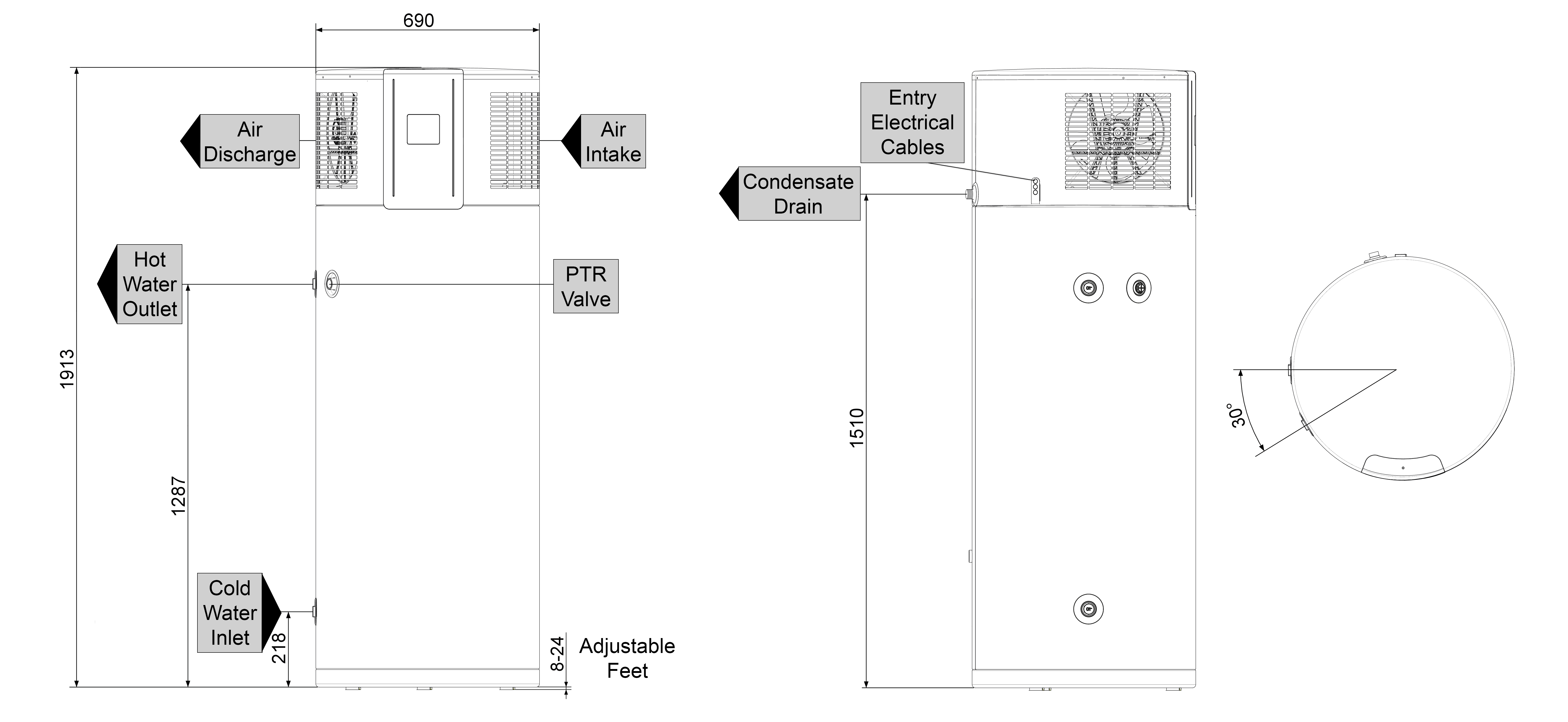 The WWK 222H and WWK 302H hot water heat pumps have a smart element situated in the top of the hot water cylinder. This smart element will switch on along with the heat pump function when a high volume of hot water is drawn off from the hot water tank. It assists the heat pump to heat approximately the top 80 litres of the tank, aiding hot water recovery for high-demand situations.